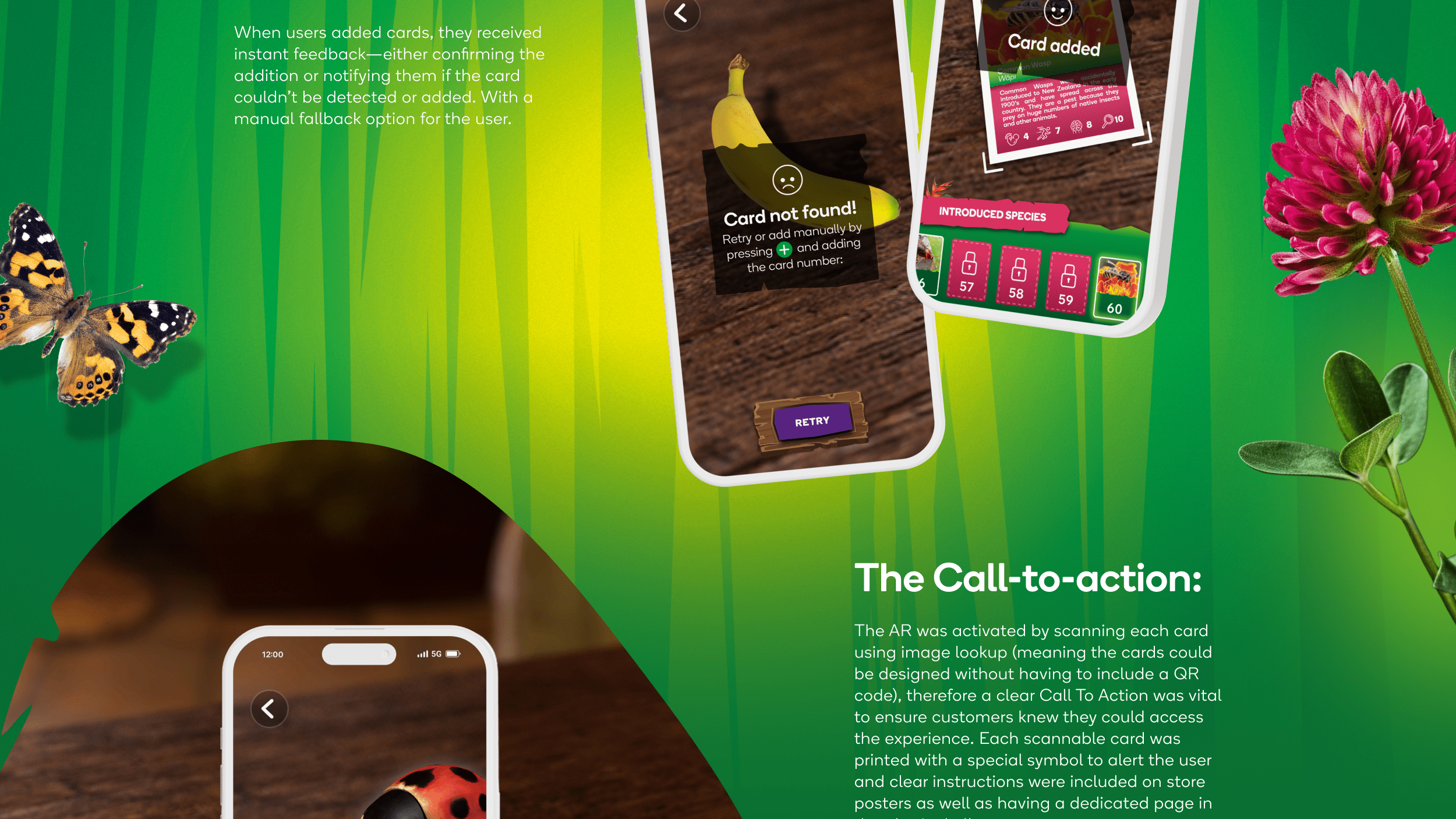 My role as a UX & UI Designer at Zappar involved our team collaborating with Craze to develop an immersive, AR-powered loyalty campaign for New Zealand’s leading supermarket chain, Countdown. The Super Insects app was designed to bring people back into the experience regularly to collect all the cards, ensuring a constant cadence of engagement in the physical stores and at-home, across the eight-week campaign —creating an engaging, interactive experience that delivered strong results across key performance metrics